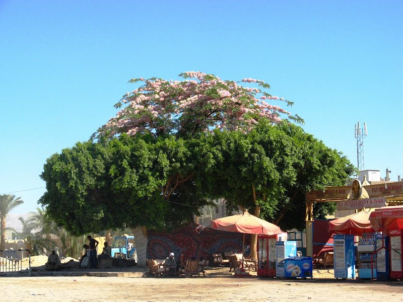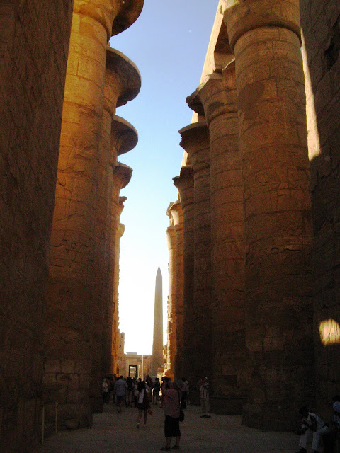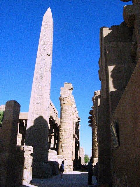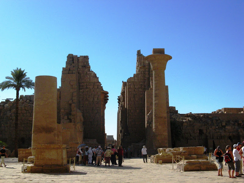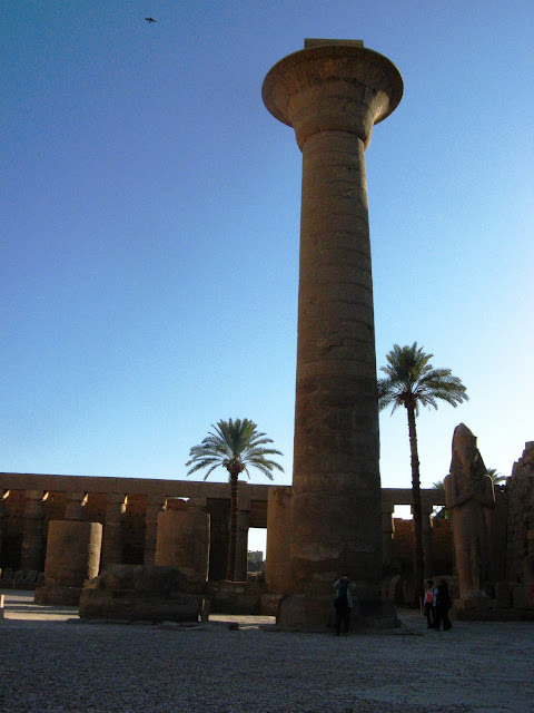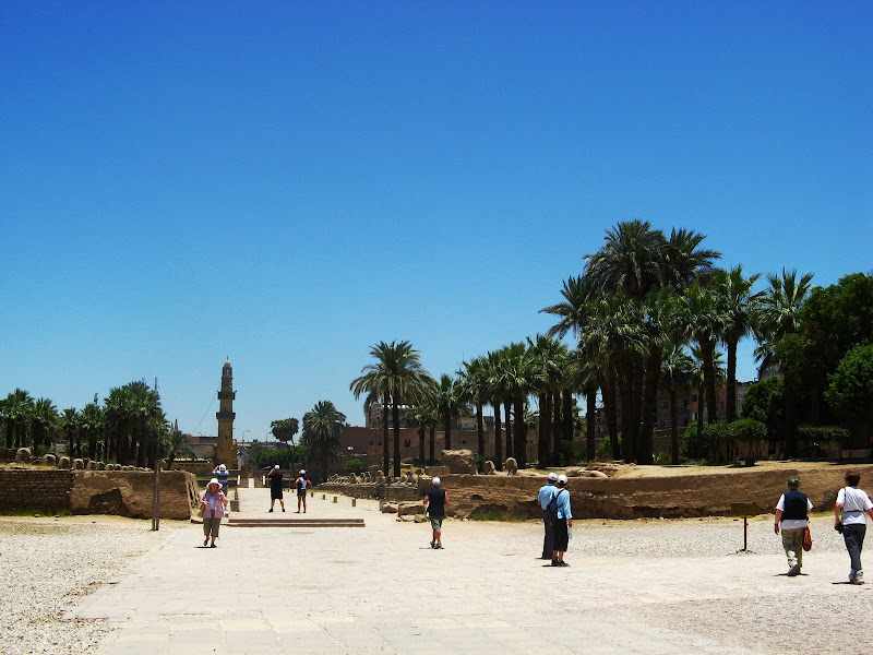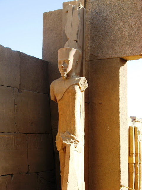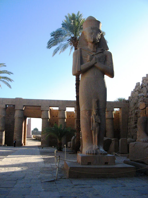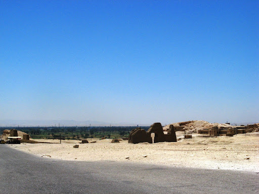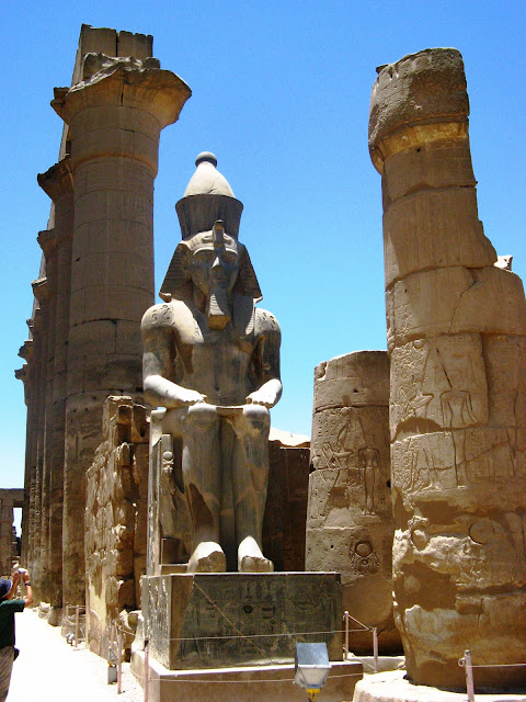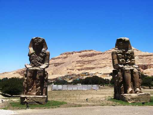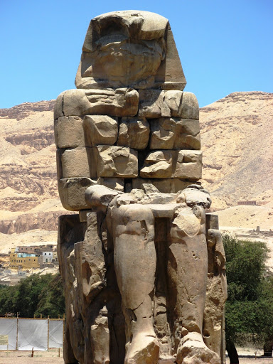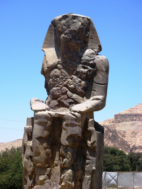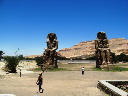 從女王神殿離開, 途經萬儂神像(Colossi of Memnon)。這兩尊鉅大的神像身後本是一座法老陵墓, 而神像則本來豎立在陵墓的第一塔門前。 現在陵墓已經全毀了, 只剩下高十八米的石像仍無視於年月的洗禮。