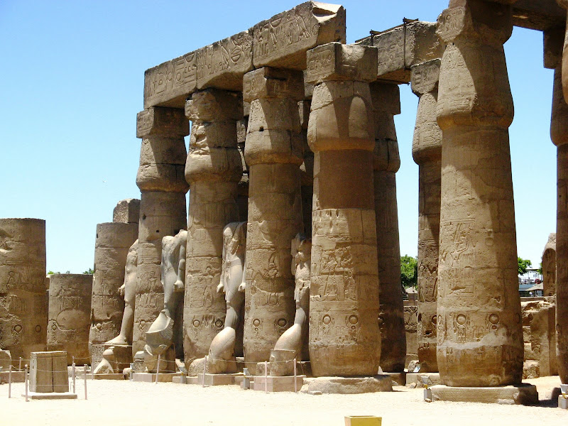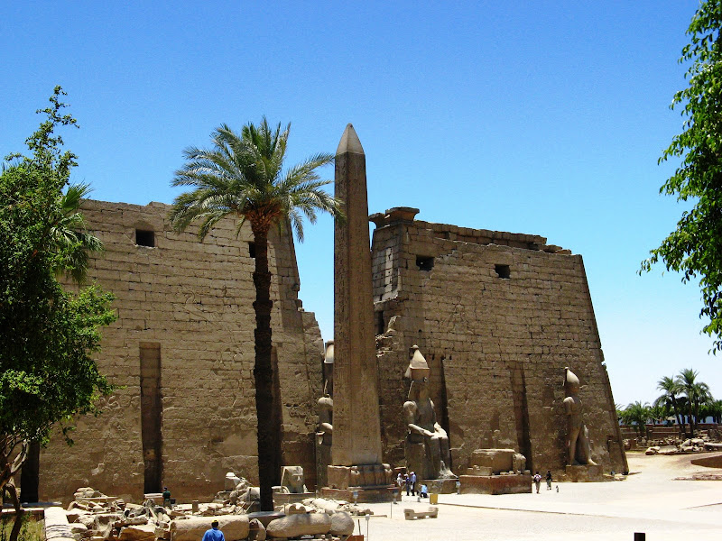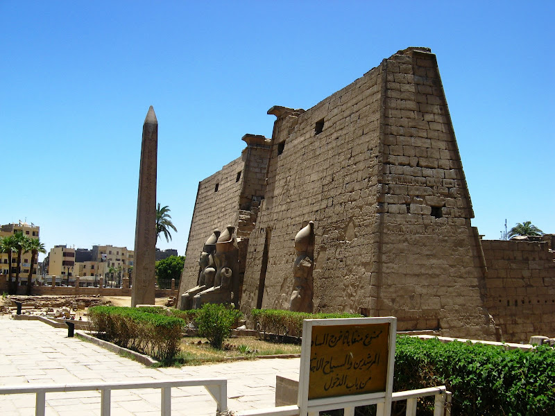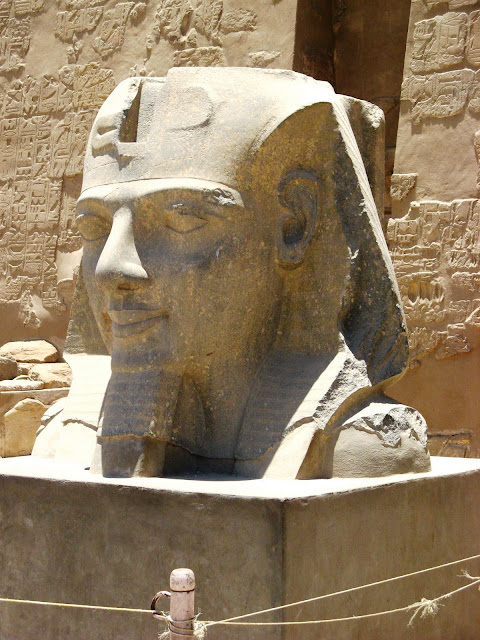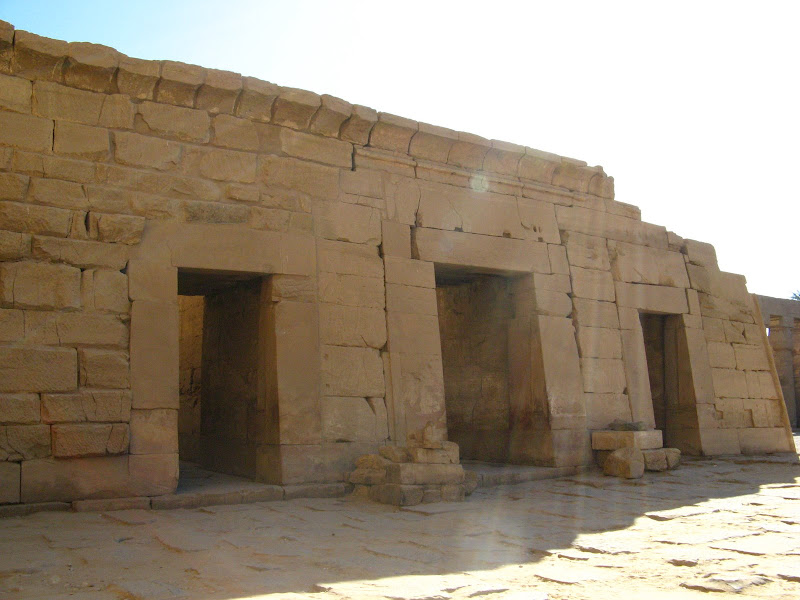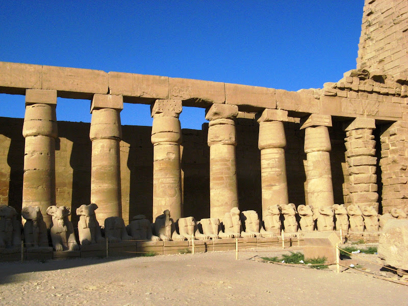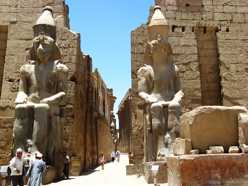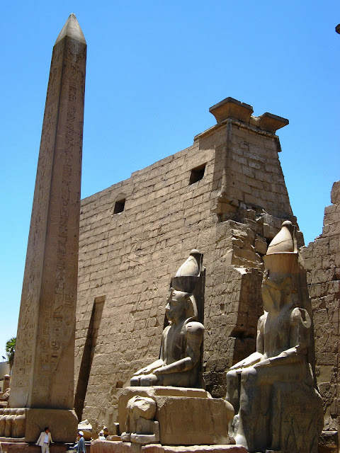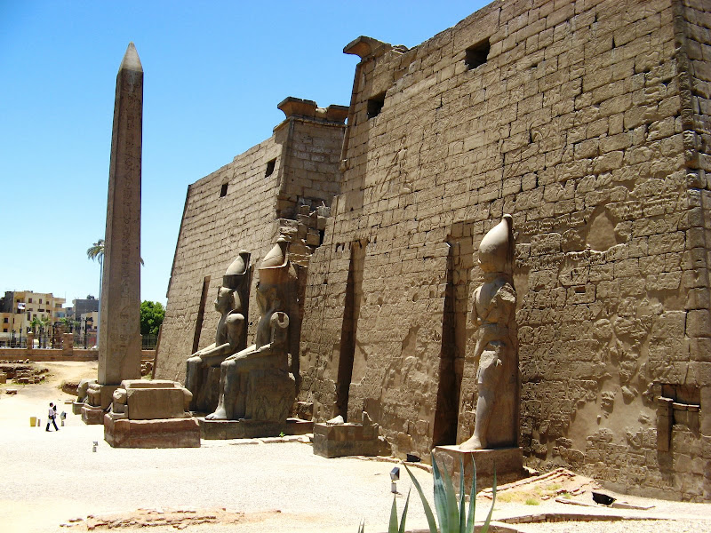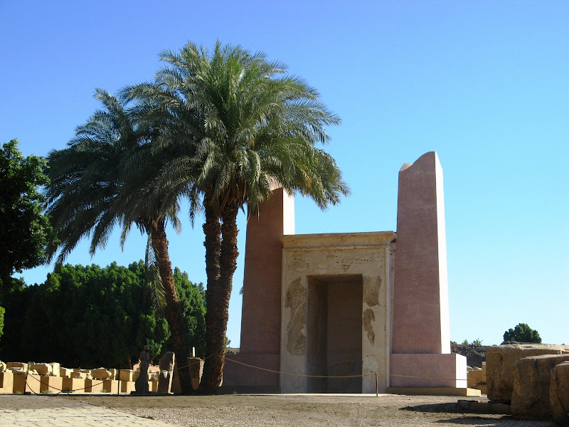 樂蜀神廟為拉美西斯二世所建。 不錯這位法老在打敗了希泰族(Hittites)人後, 為表示對底比斯的守護神阿蒙(Ammom)、慕特(Mut)和可斯(Khons)的尊敬而建了這神殿。 一年一度的迎神慶典也是在這裡舉行。拉美西斯二世對外不斷征戰擴張, 對內大興土木的結果, 自然是國庫空虛, 兵疲民乏。 強盛的第十九王朝亦由此走向衰落。 看來拉美西斯二世和漢武帝、唐玄宗、乾隆也真難兄難弟呢。