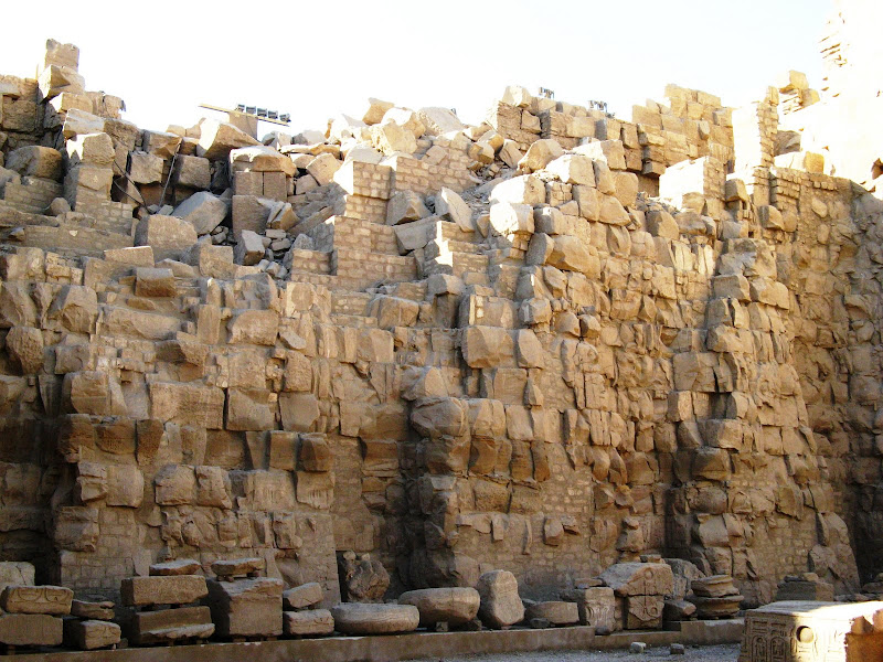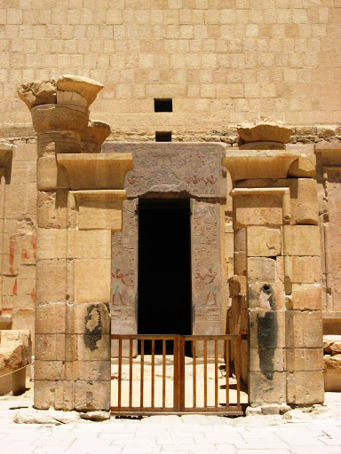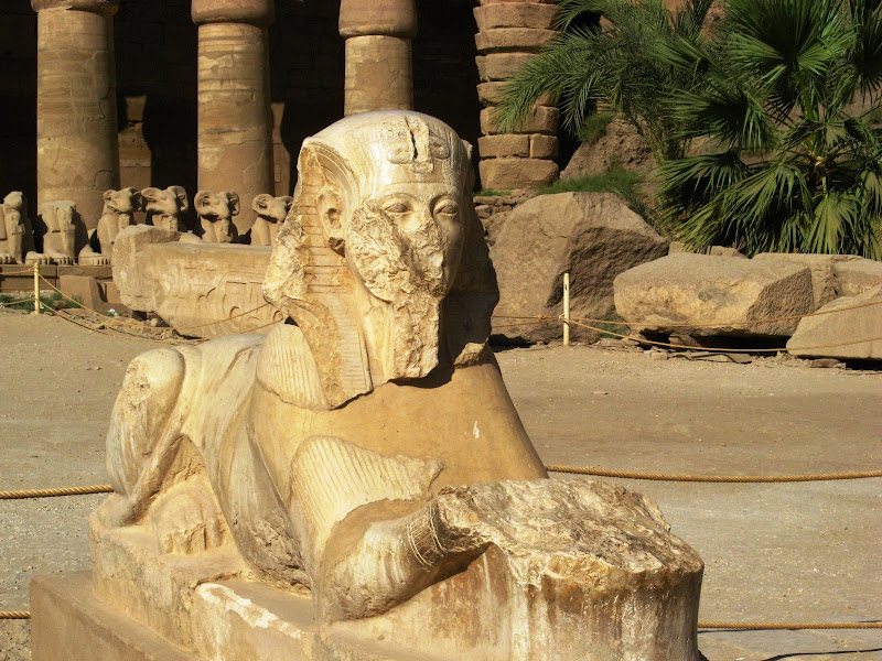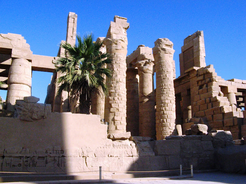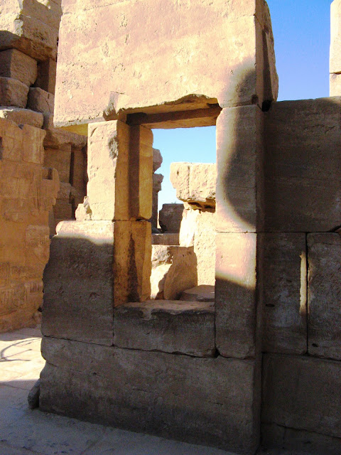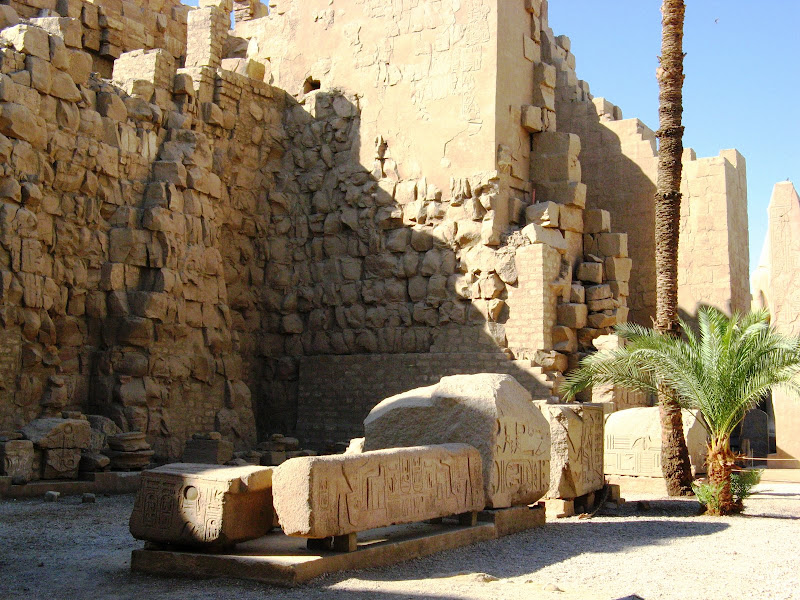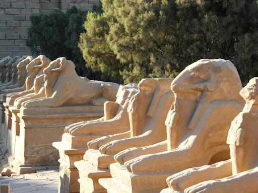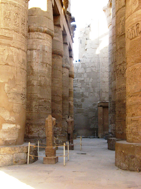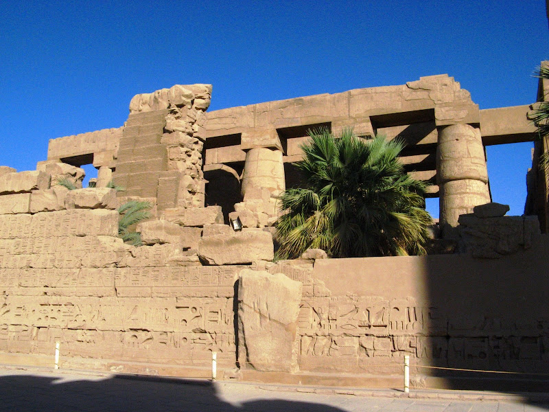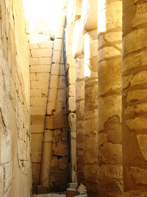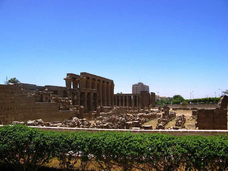 樂蜀神廟為拉美西斯二世所建。 不錯這位法老在打敗了希泰族(Hittites)人後, 為表示對底比斯的守護神阿蒙(Ammom)、慕特(Mut)和可斯(Khons)的尊敬而建了這神殿。 一年一度的迎神慶典也是在這裡舉行。拉美西斯二世對外不斷征戰擴張, 對內大興土木的結果, 自然是國庫空虛, 兵疲民乏。 強盛的第十九王朝亦由此走向衰落。 看來拉美西斯二世和漢武帝、唐玄宗、乾隆也真難兄難弟呢。