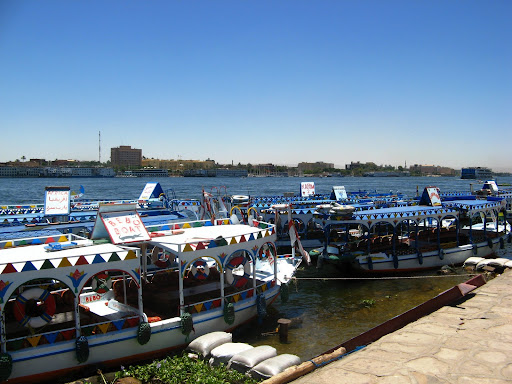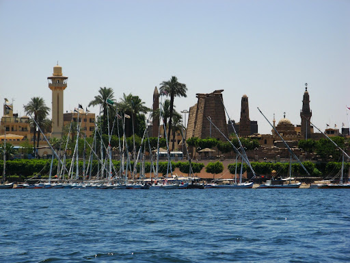 看過神像, 我們乘坐小汽船渡過尼羅河, 回到樂蜀市參觀雄偉的樂蜀神廟(Luxor Temple)。 還在河中心時已可看到神廟高高的塔樓(右):